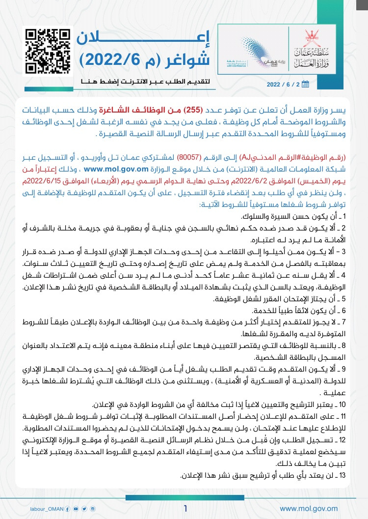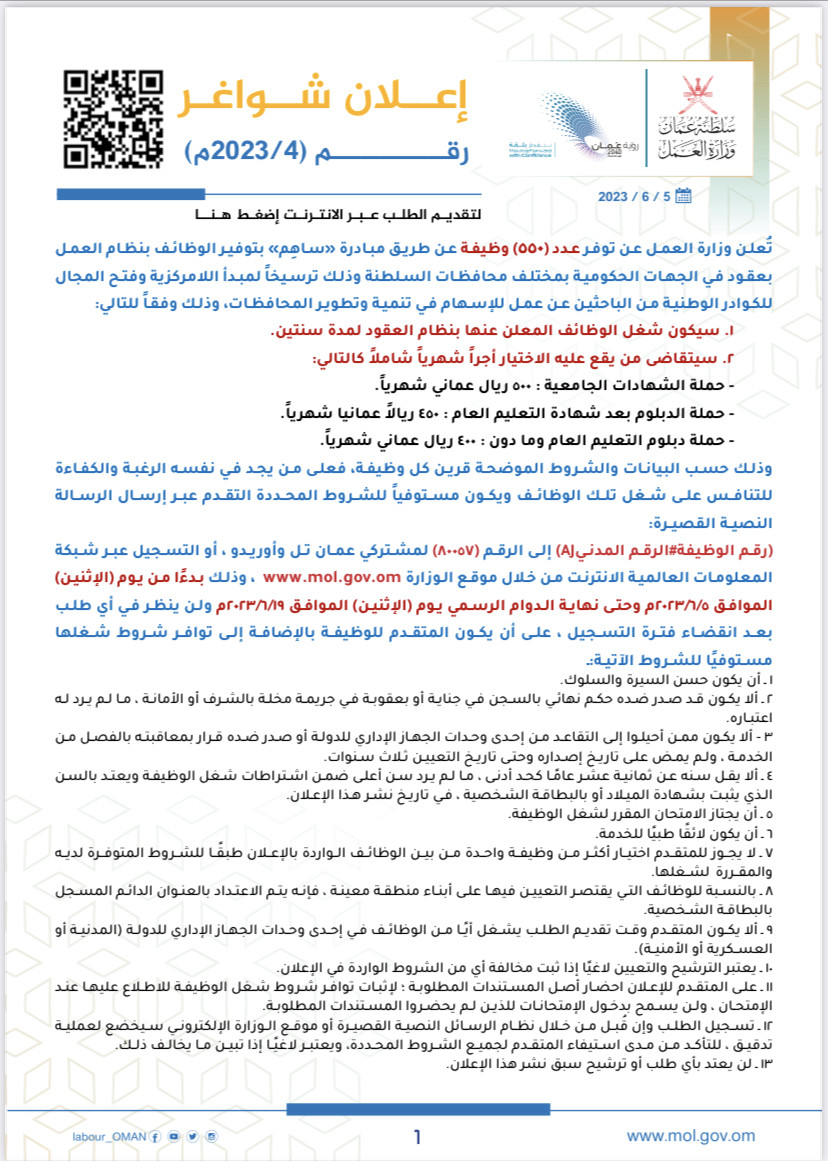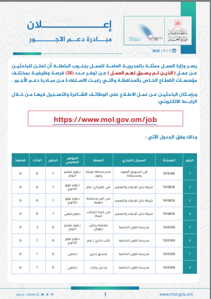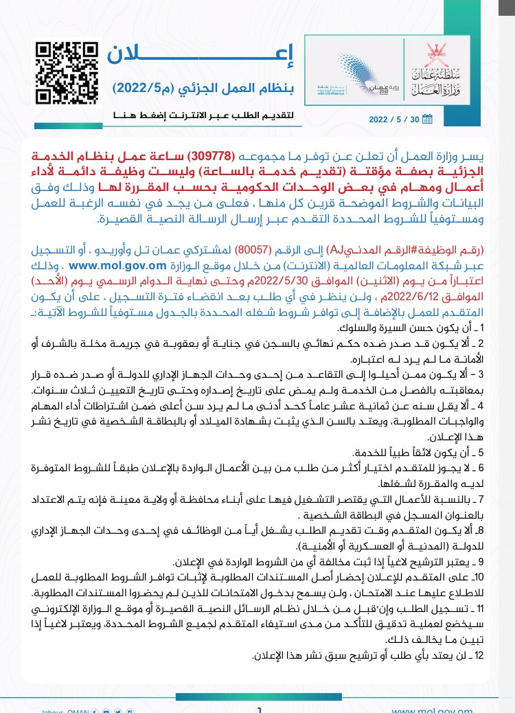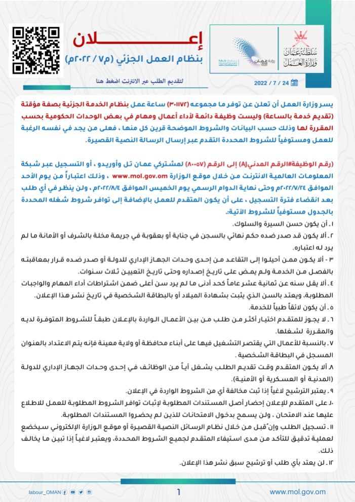 إعلان بنظام العمل الجزئي م٧ /٢٠٢٢