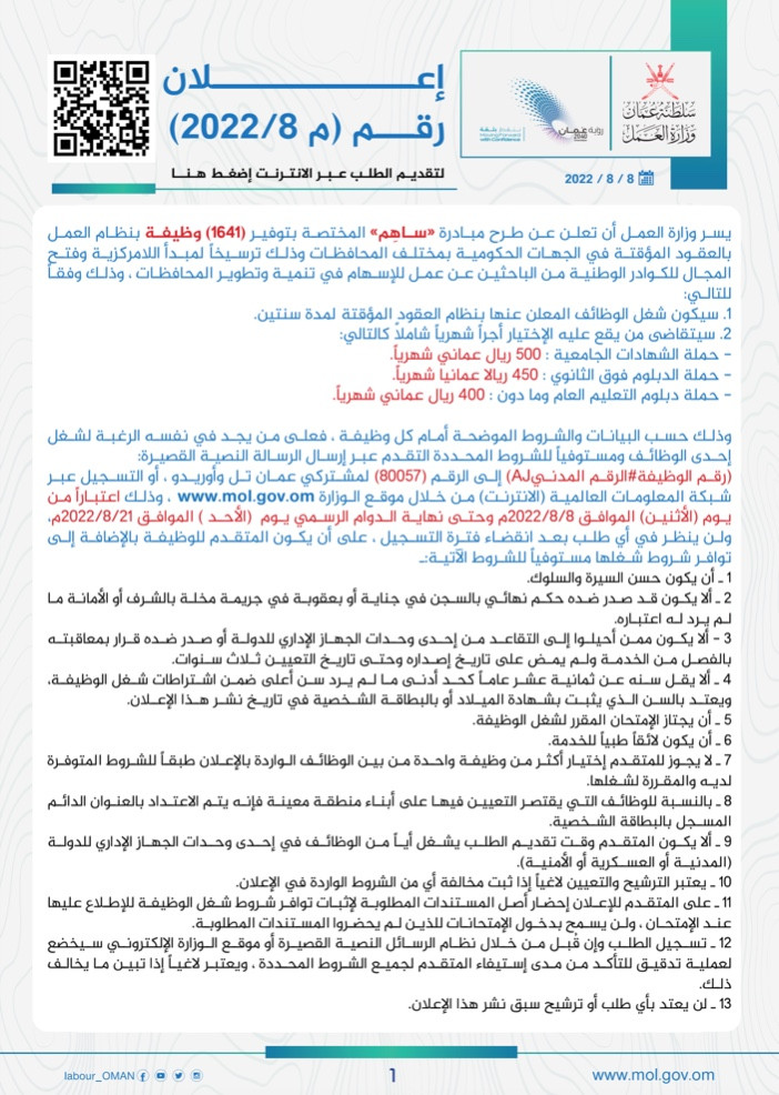 إعلان العمل بالعقود المؤقتة م٨ /٢٠٢٢