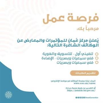 عمان للمؤتمرات والمعارض يعلن عن توفر لديه مجموعة من الوظائف الشاغرة والموضحة في مرفق الاعلان.