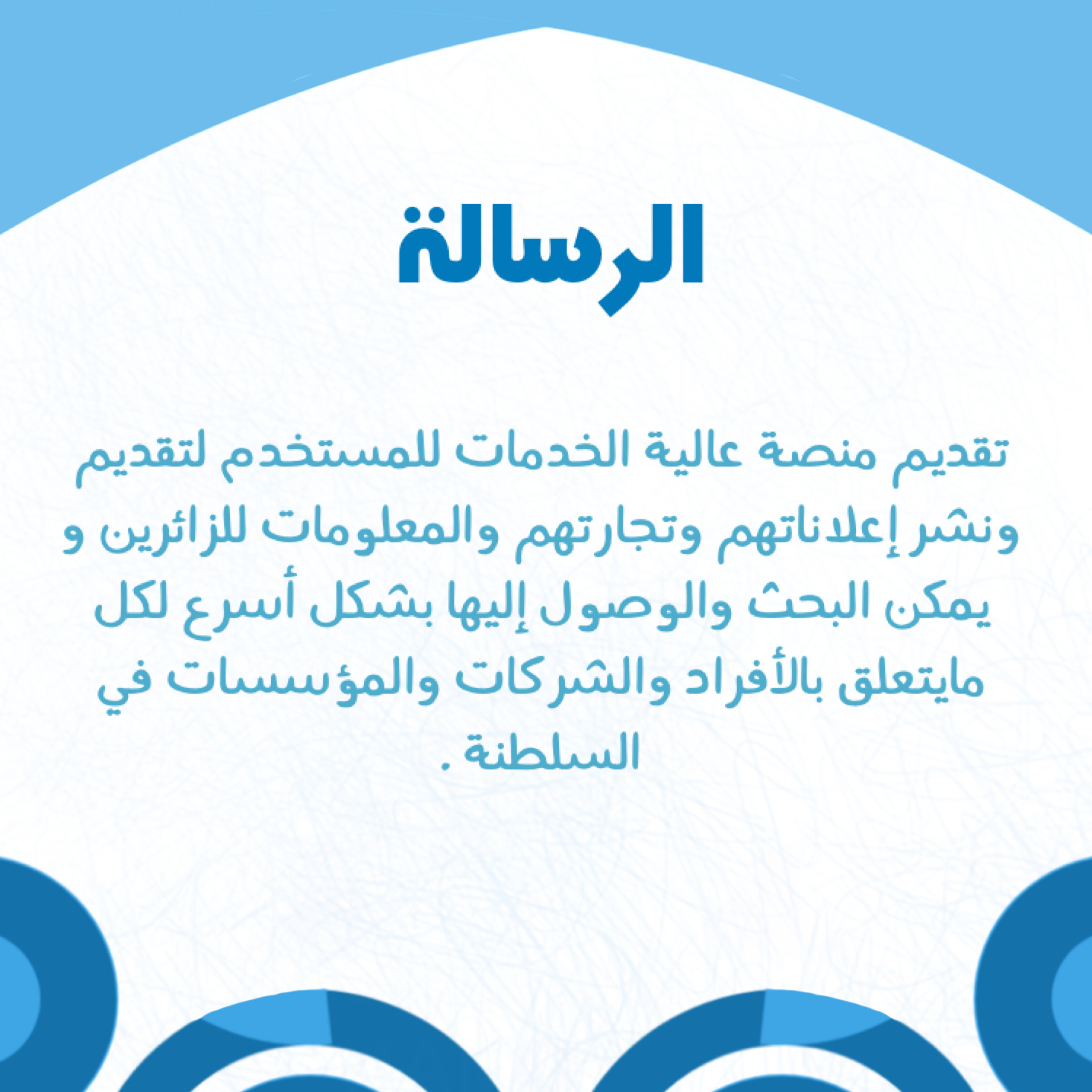 تقديم منصة عالية الخدمات للمستخدم لتقديم ونشر إعلاناتهم وتجارتهم والمعلومات للزائرين و يمكن البحث والوصول إليها بشكل أسرع لكل مايتعلق بالأفراد والشركات والمؤسسات في السلطنة .